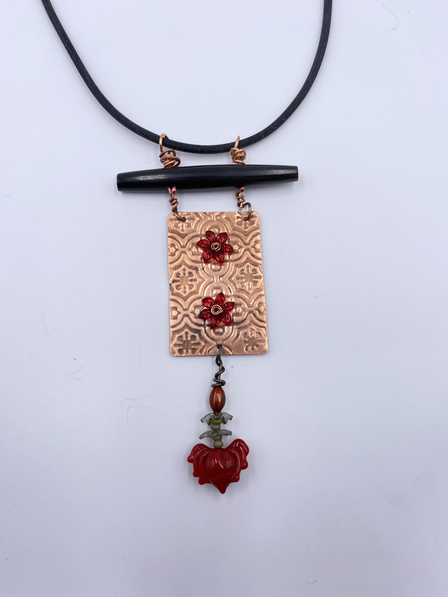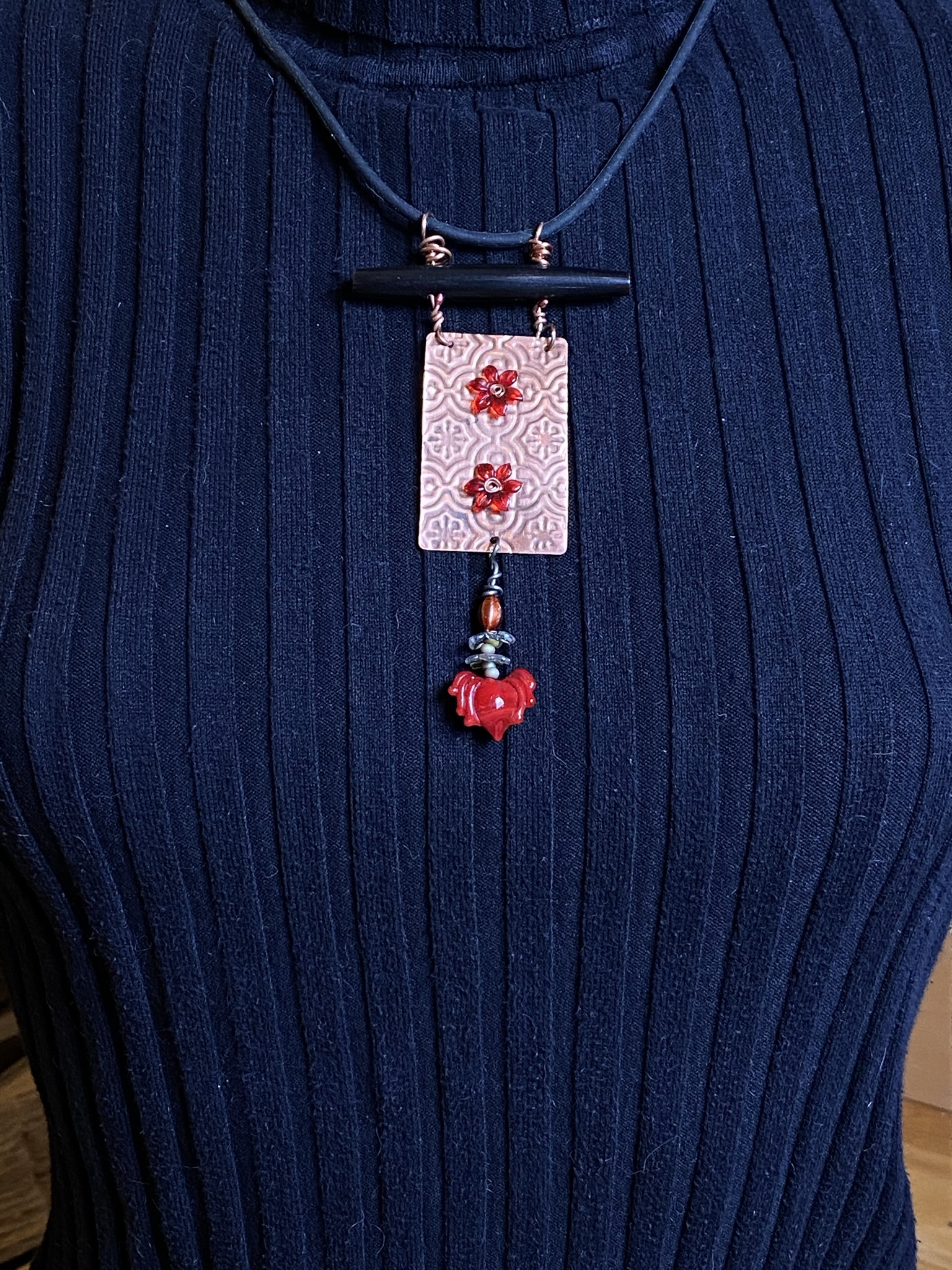 Copper, horn, hand-blown glass heart, and Shrinklits